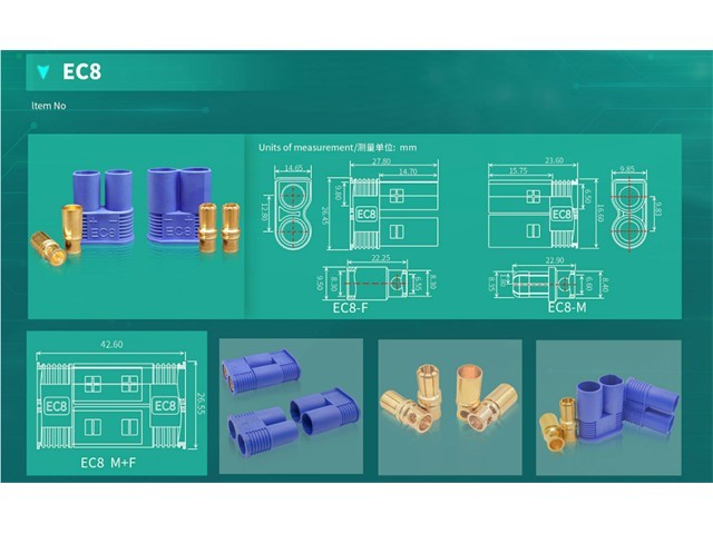 EC8 Battery Connector Pair 2pole 180A - Cable end Male/Female 5MM Gold Plated Bullet Terminals With Insulated Housing
