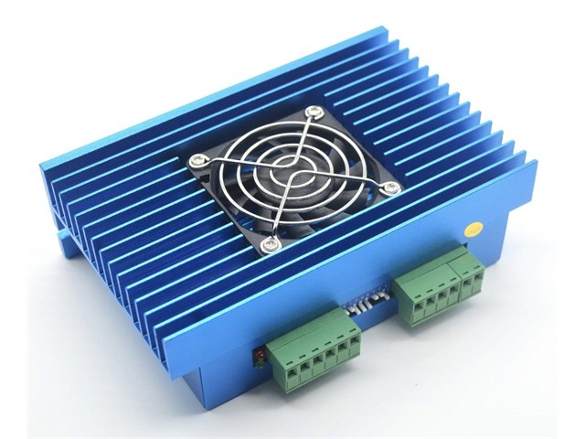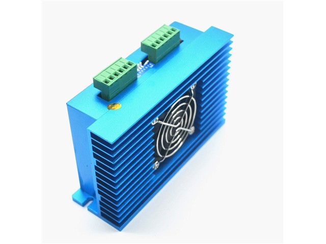 DM860H DSP Digital Stepper Motor with Fan. Can Drive 4-Wire, 8-Wire Two-phase Stepper Motor. Voltage Input Range: 18~80V AC / 24-110V DC. Maximum Current: 7.2A, Resolution: 0.1A. Subdivision Range: 400~25600PPR