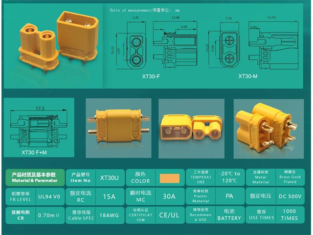 XT30U Battery Connector 2pole 30A - Cable End Polarized Male/Female 2MM Gold Plated Bullet Terminals.
