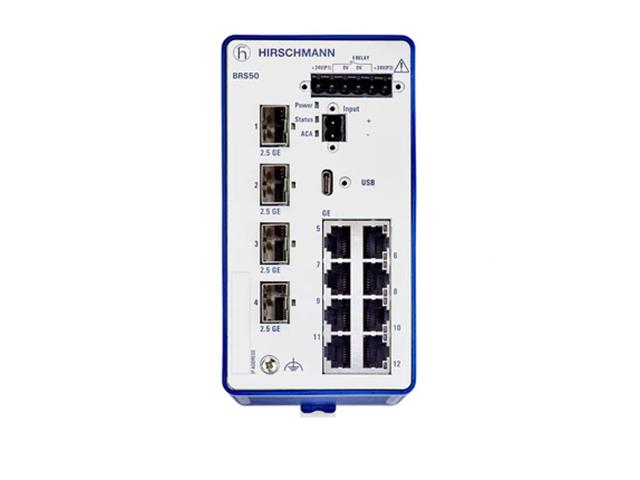 Hirschmann BRS50-8TX/4SFP is a 12-Port Managed Switch with 8x 10/100/1000BASE TX / RJ45, 4x 100/1000/2500Mbit/s Fiber, 4x SFP Slot (100/1000/2500 Mbit/s)