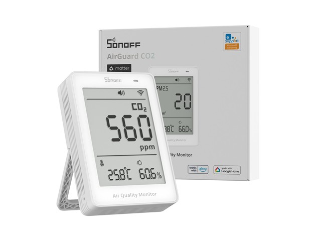Wi-Fi/Matter CO₂ Monitor with NDIR Sensor, Reports CO₂, Temp, Humidity, 5 S Updates, USB-C Powered, Integrates with Matter Smart Home, Alerts on Thresholds, Data Logging
